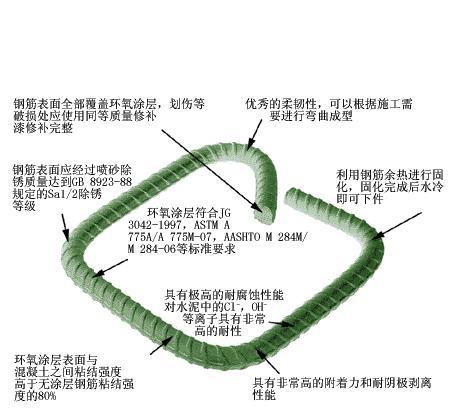 1. 除锈 在制作环氧树脂涂层前,必须对钢筋表面进行净化处理,其质量应达到GB8923-88规定的目视评定除锈等级Sa2.5级,对净化后的钢筋表面质量进行检验,对符合要求的钢筋方可进行涂层制作。净化后的钢筋表面不得附着有氯化物,表面清洁度不应低于95%;净化后的钢筋表面应具有适当的粗糙度,其波峰至波谷间的幅值应在0.04~0.10之间。涂层制作应尽快在净化后清洁的钢筋表面上进行。 ![]() 涂层应采用环氧树脂粉末以静电喷涂方法在钢筋表面制作,并根据涂层材料生产厂家的建议对涂层给予充分养护。